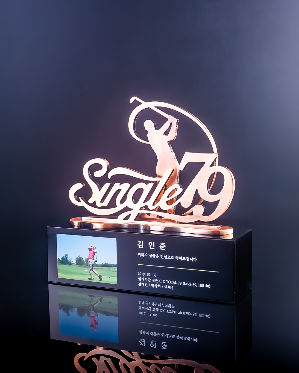 완전 덥고 화창한 8월 리베라cc에서 싱글하신 하프로님(진짜 프로는 아님)~ 골프실력이 출중해 싱글이 처음이 아닌줄 알았는데 조심스럽게 꺼낸 말 "찐 싱글은 오늘이 처음입니다." 그럼 부킹 한번 더하고, 트로피 만들고... 김프로님 지휘아래 트로피 담당이 되어 폭풍 검색으로 의 작품이 색깔도 좋고, 디자인도 멋진 정말 갖고 싶은 트로피여서 단톡방에서 컨펌받고 주문하였다.